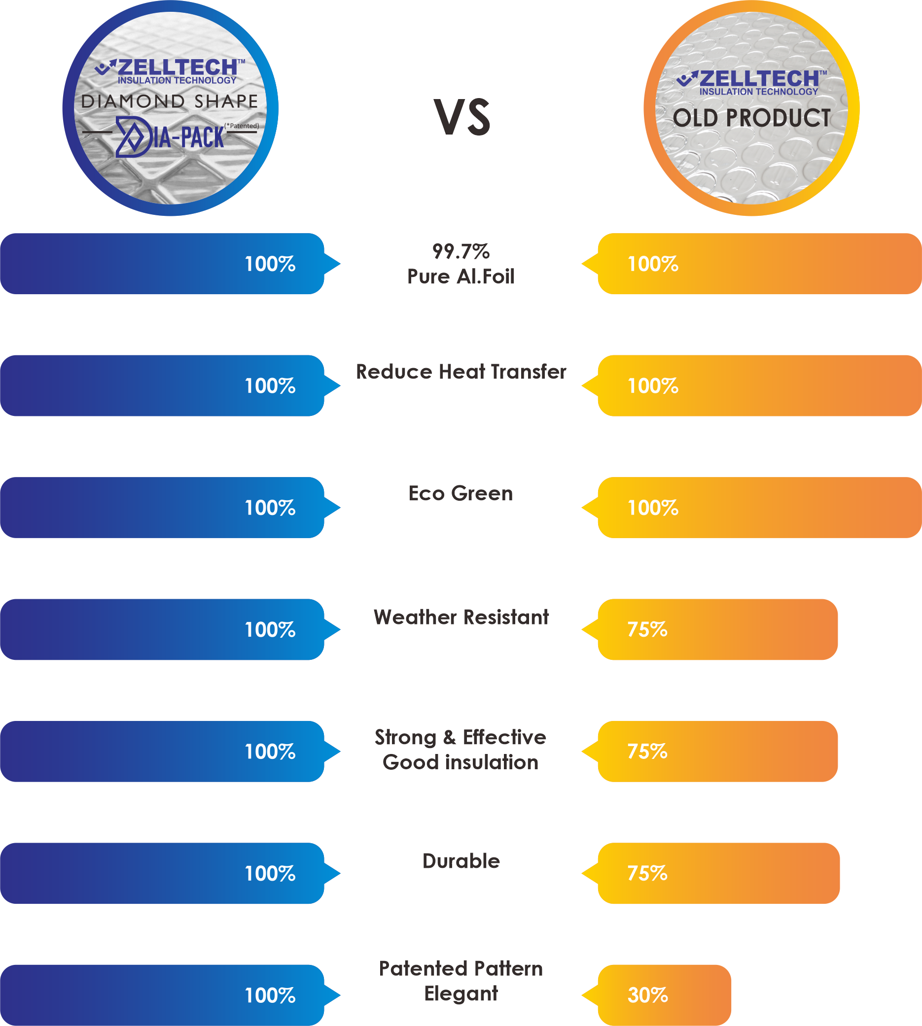 ZELLTECH™ Dia-Pack Insulationhas a diamond pattern. It is the only one with a patent certificate. The diamond pattern makes ZELLTECH™ insulation more effective in reducing heat in a building due to the high bubble density, higher durability under pressure, and more elegant look when installed.